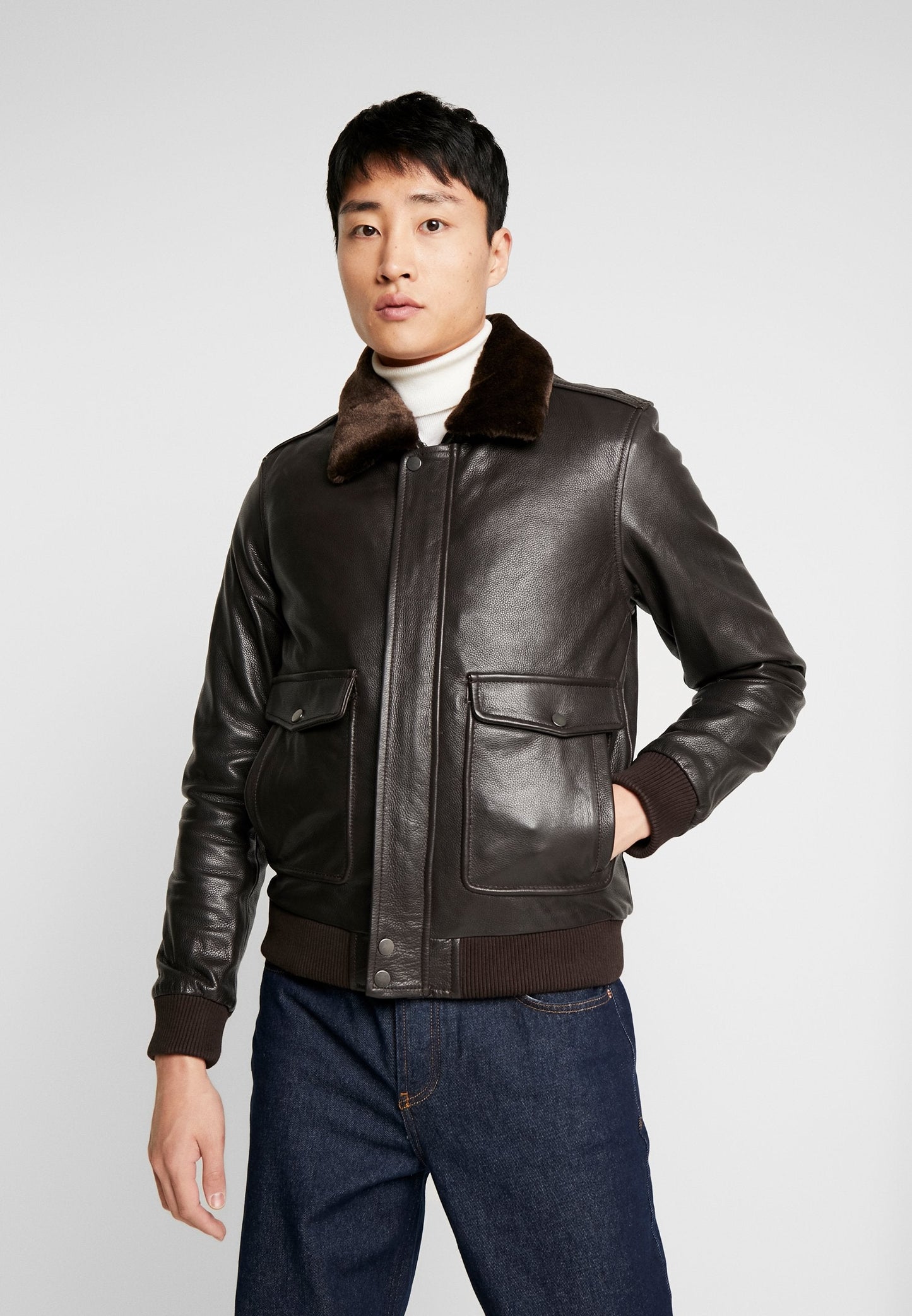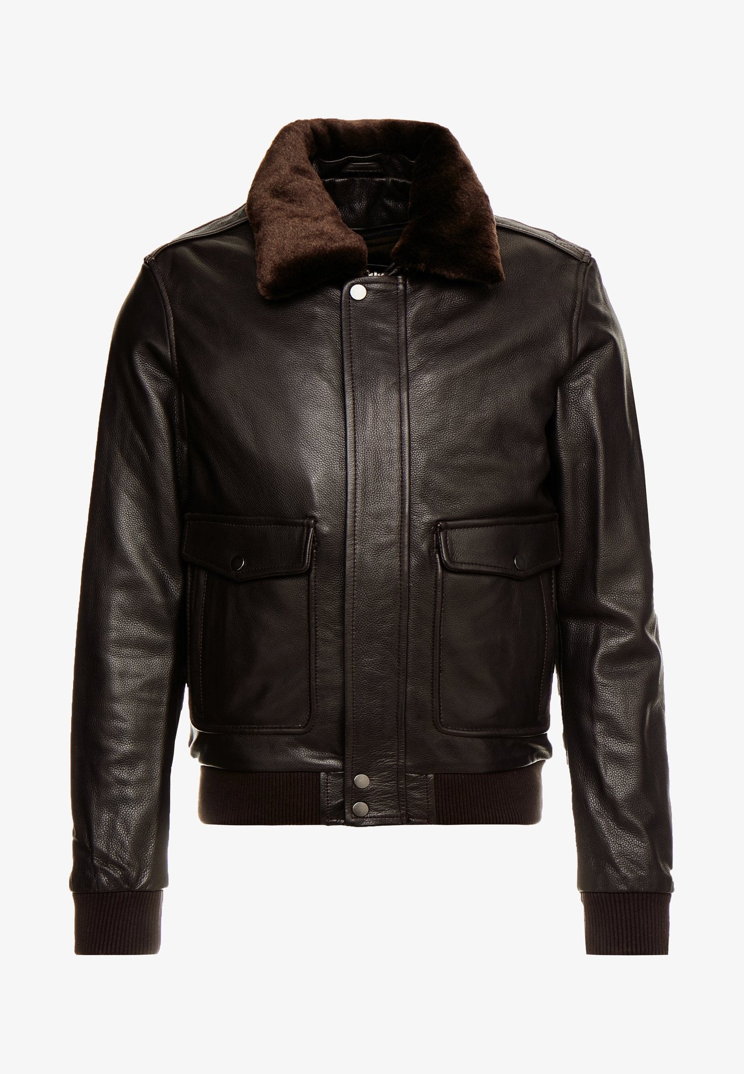 Men's Dark Brown Leather Fur Collar Bomber Jacket