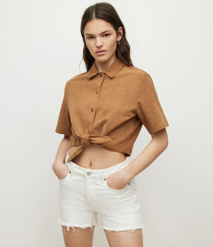 Women's Brown Cropped Suede Leather Shirt with Trendy Fit