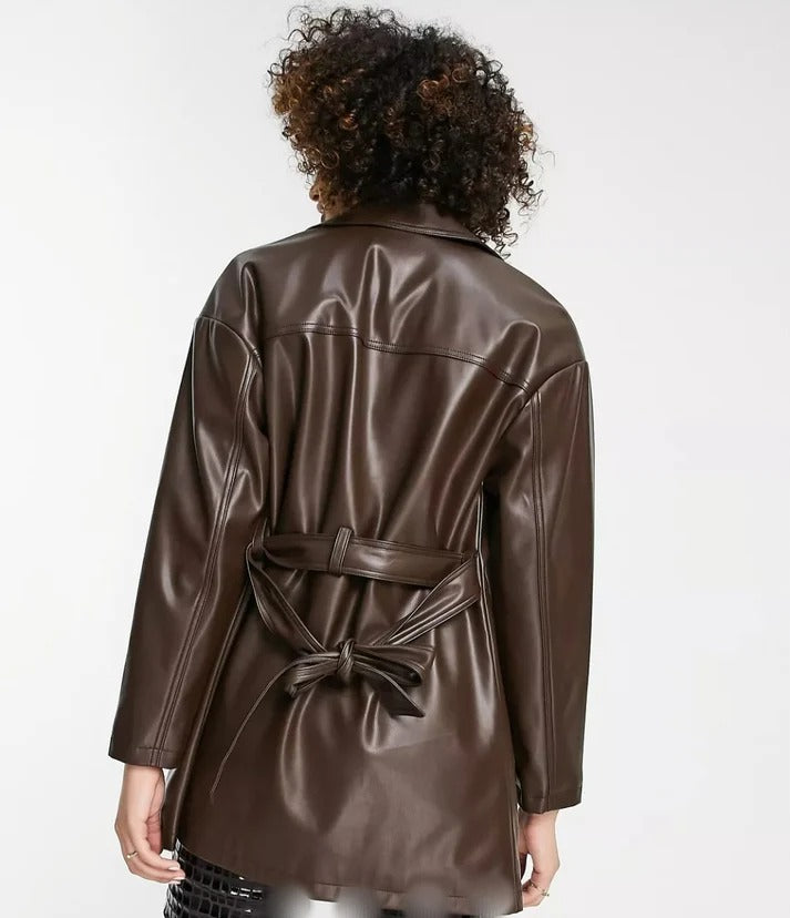 Redefine sophistication with the Women’s Chocolate Brown Leather Shirt – Belted Tailored Fit Elegance. Crafted from supple faux leather, it features a sleek belted waist, tailored structure, and rich chocolate tone for an elevated day-to-night look. Ideal for refined street style or smart casual wear.