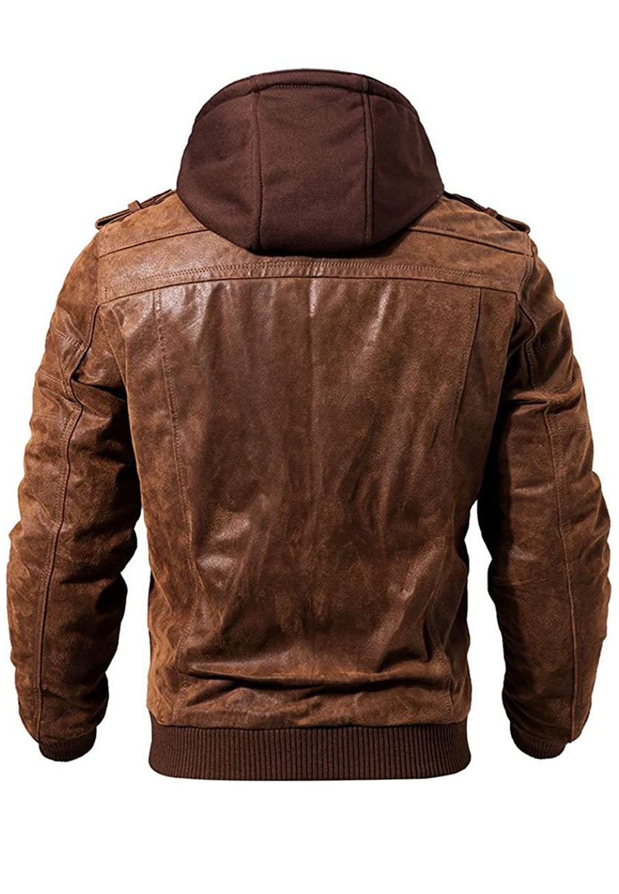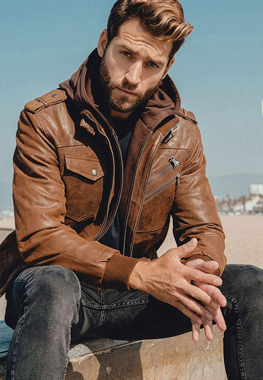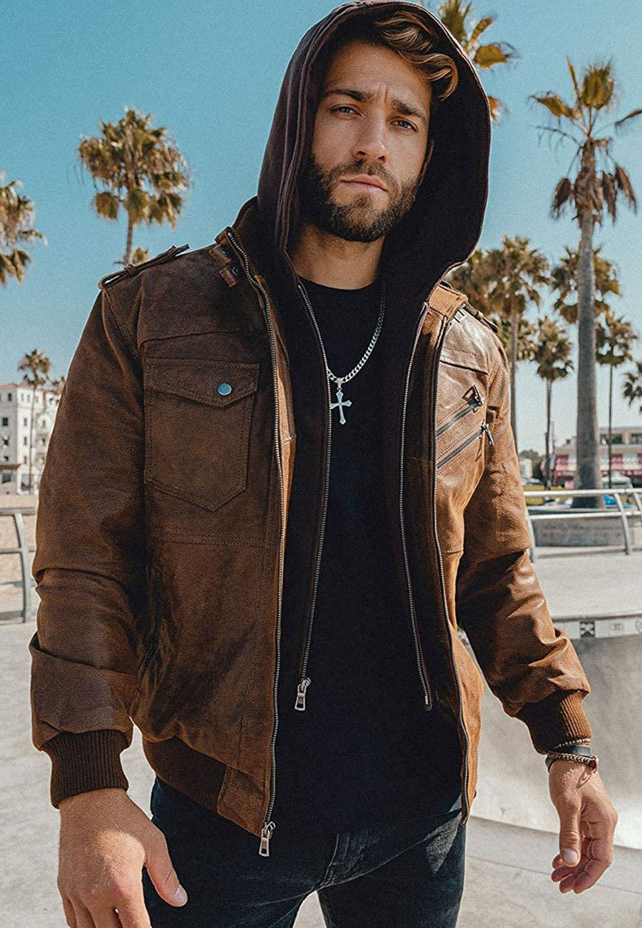 Men’s Tan Brown Leather Removable Hood Bomber Jacket