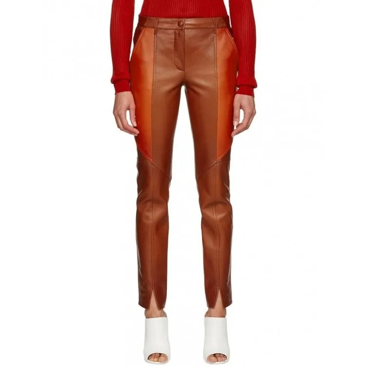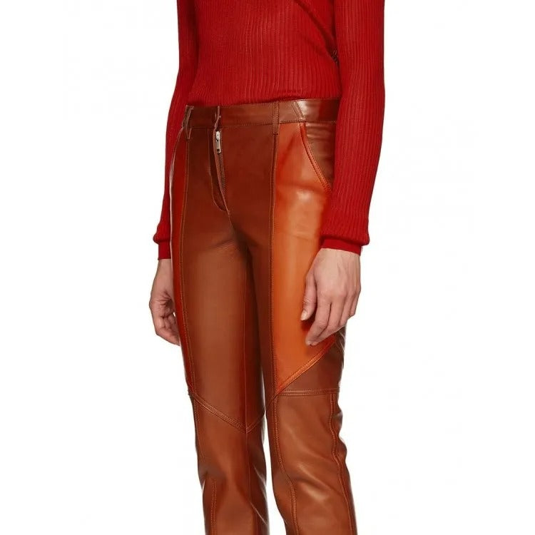 Ladies Slim Fit Paneled Lambskin Orange Leather Pants
