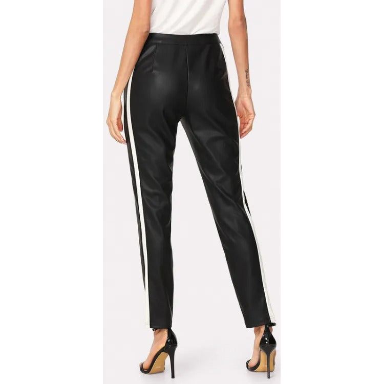 Dress up your outfit with these stylish ladies' two-tone black and white leather pants. Crafted with 100% genuine leather, these pants are designed to be comfortable and durable. The unique two-tone color combination will ensure you look fashionable and trendy.