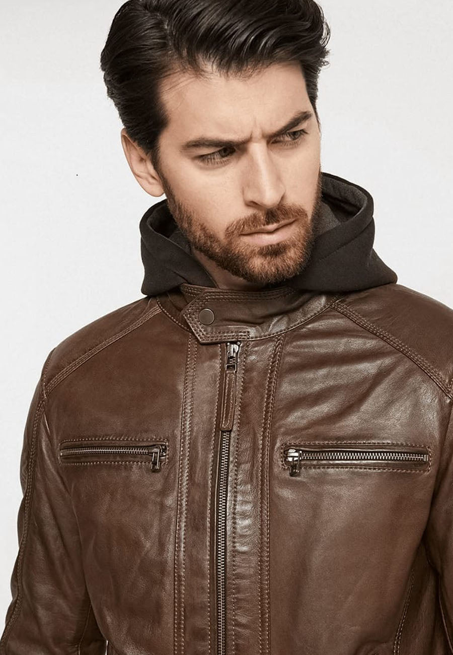 Men's Chocolate Brown Leather Jacket Removable Hood