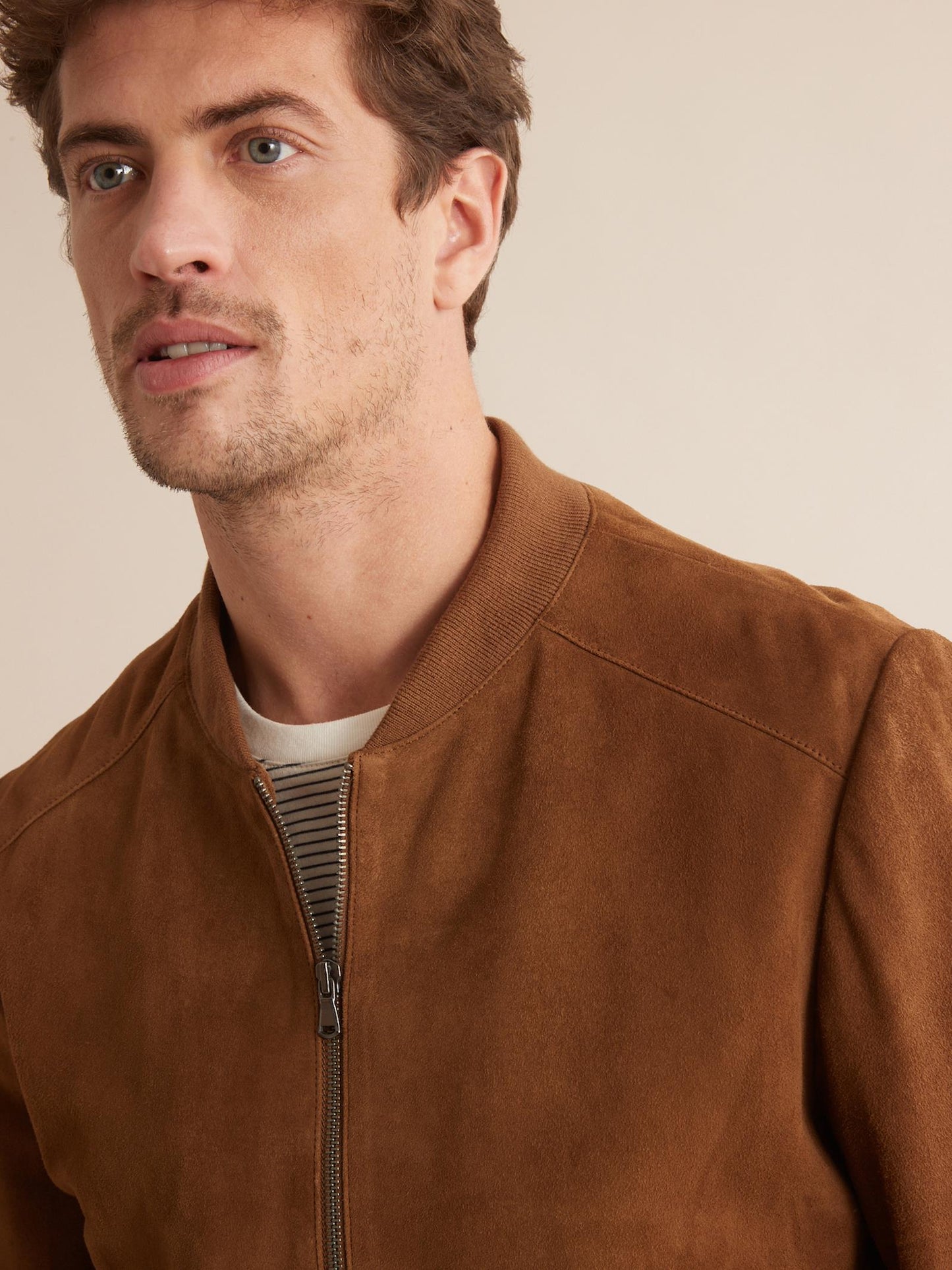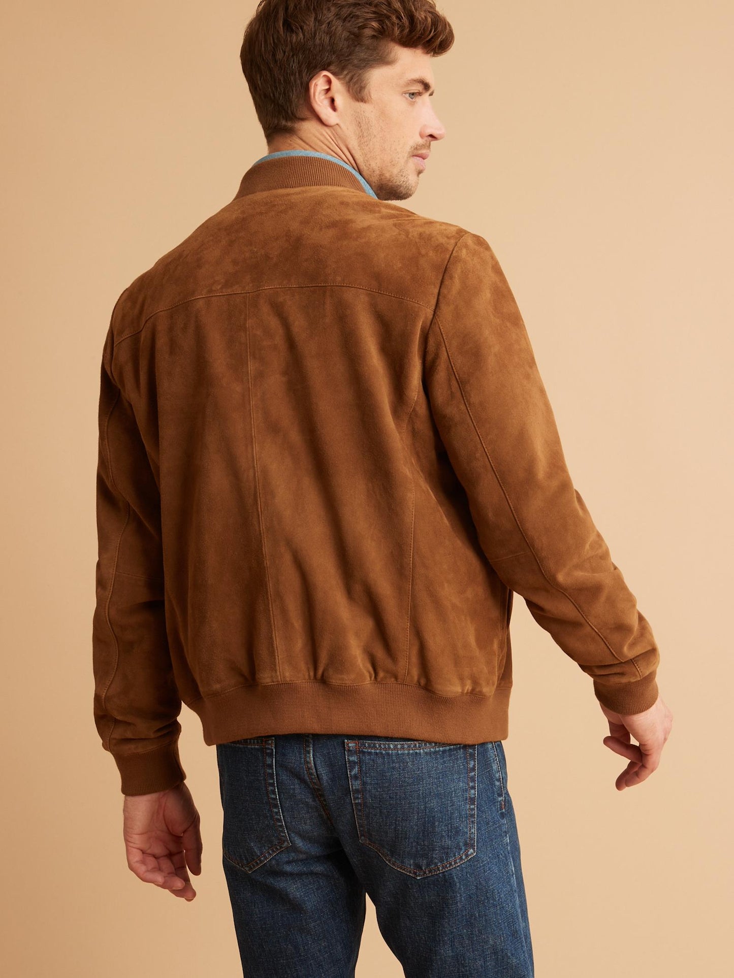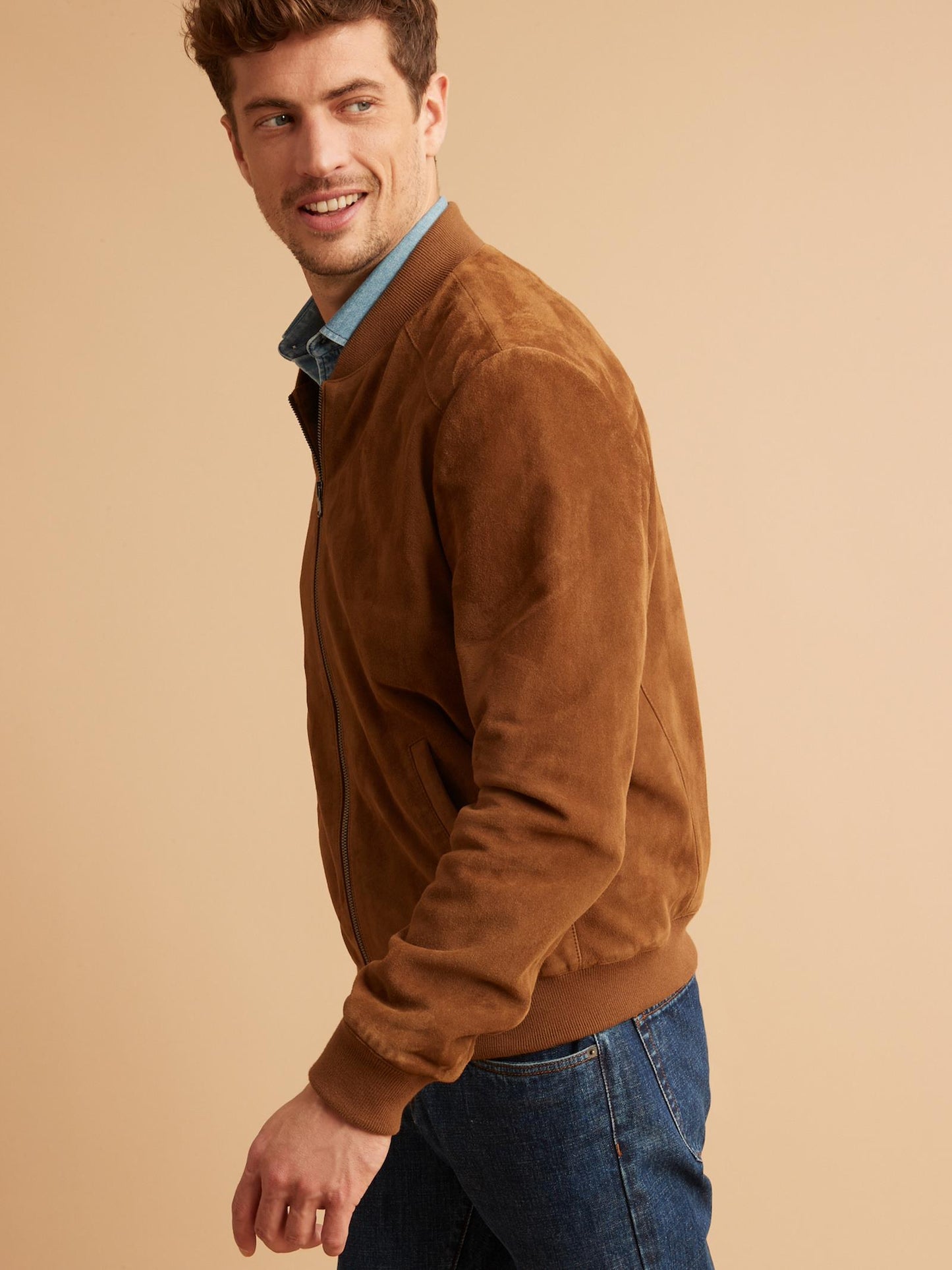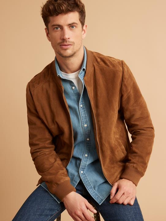 Men’s Tan Brown Suede Leather Bomber Jacket