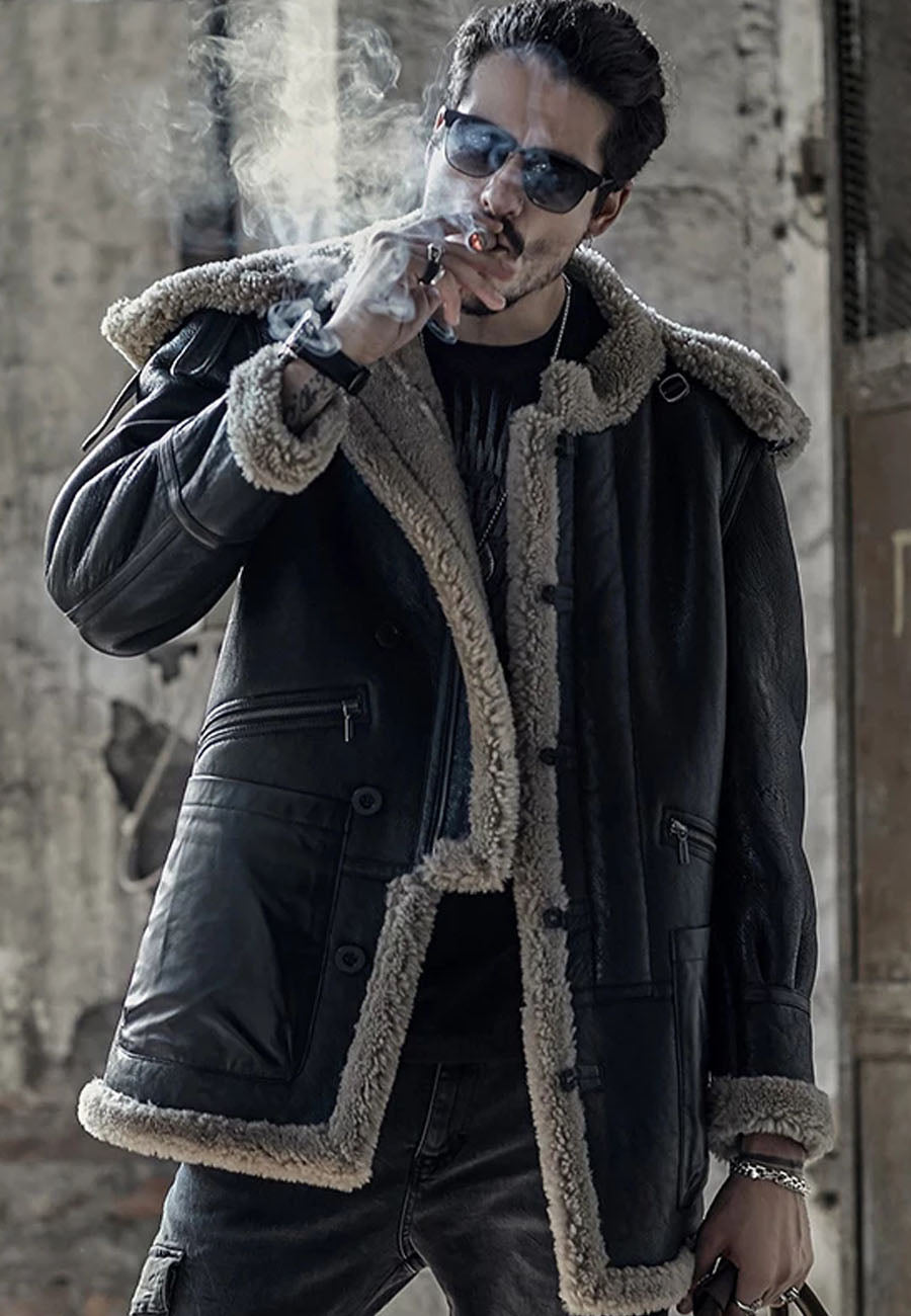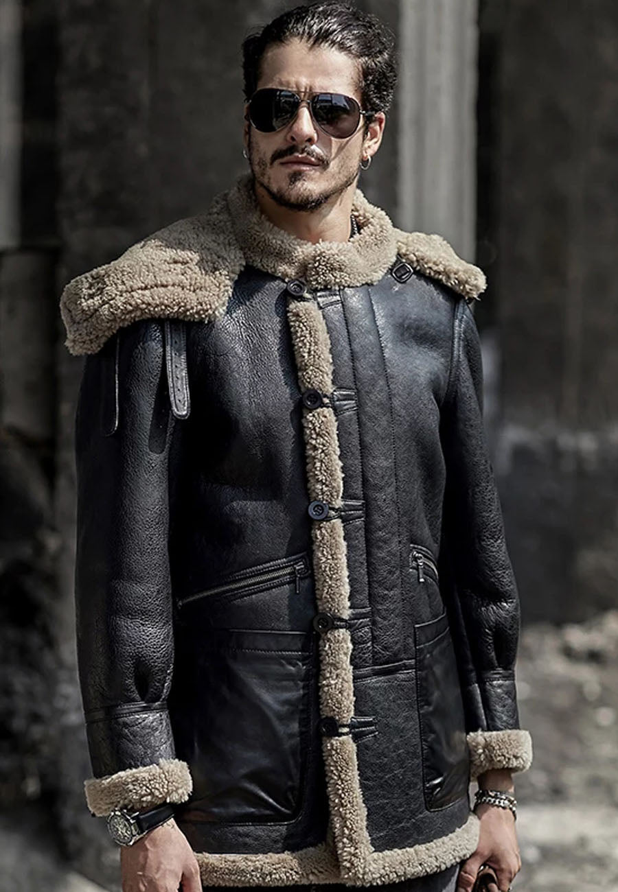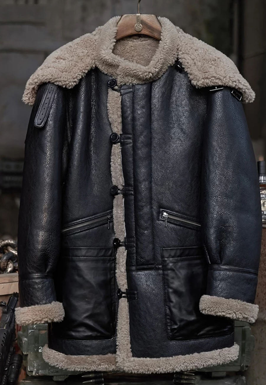 Men’s B7 Black Shearling Camouflage Hooded Long Coat