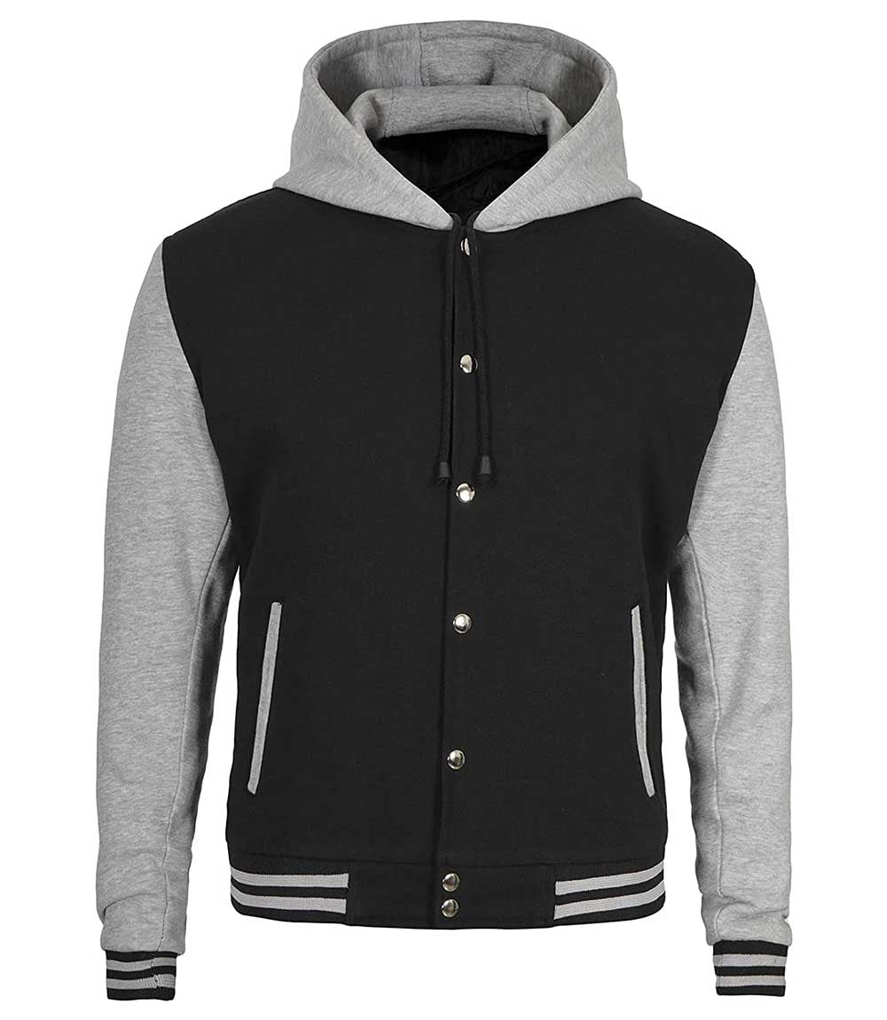 Men's Black and Grey Hooded Baseball Varsity Jacket