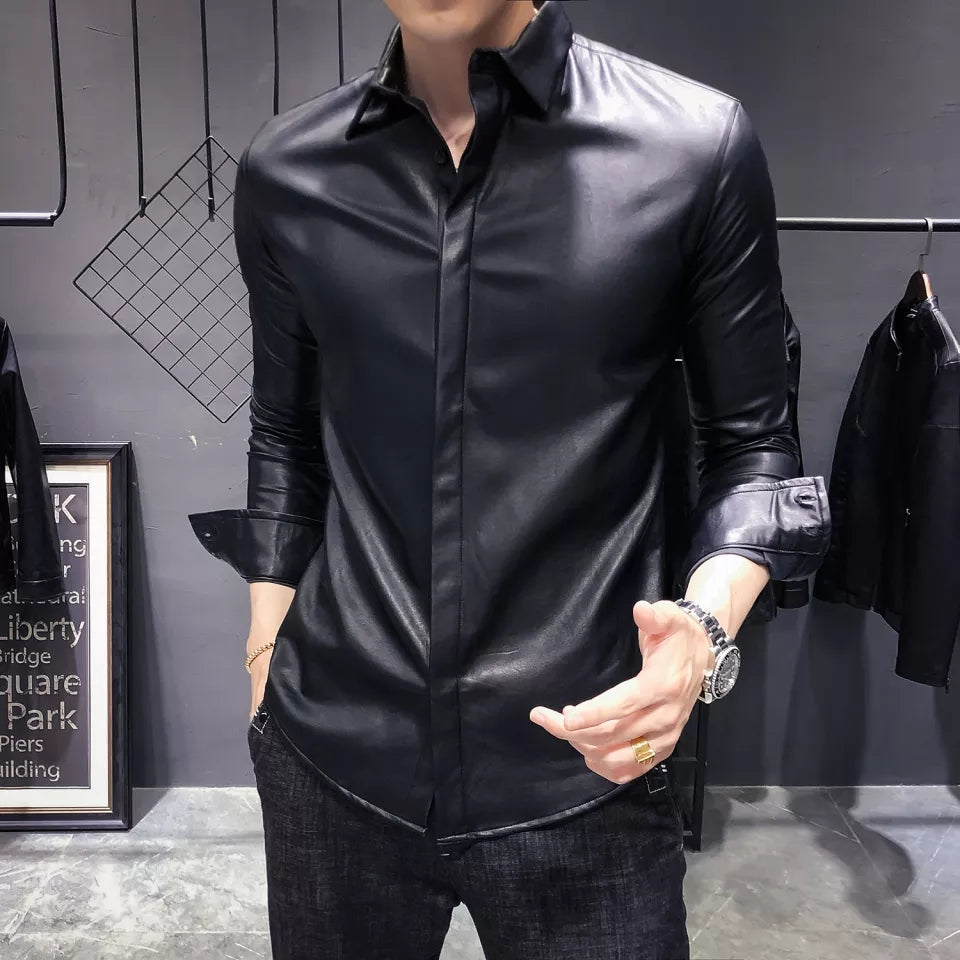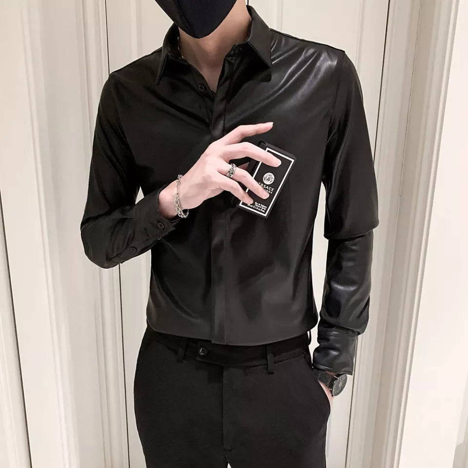 Men's Black Leather Full Sleeves Slim Fit Shirt