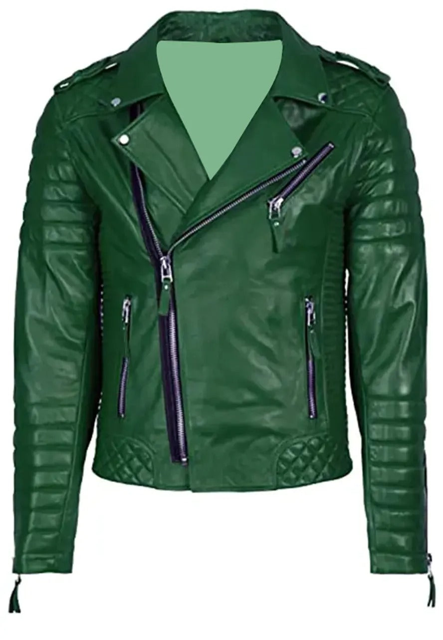 Make a bold statement with the Men’s Green Biker Leather Jacket, designed for those who love to stand out. Crafted from premium-quality leather, this jacket features a sleek green finish, a classic biker design, and functional elements like zippered pockets and durable hardware. Its comfortable fit and modern style make it perfect for rides or casual outings. Add a pop of color to your wardrobe with this must-have piece.