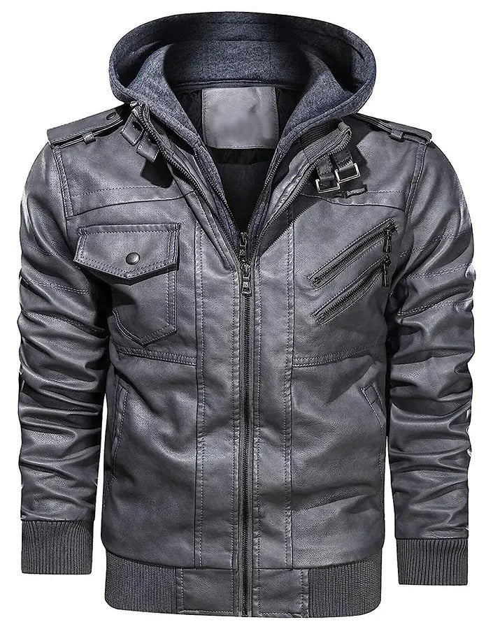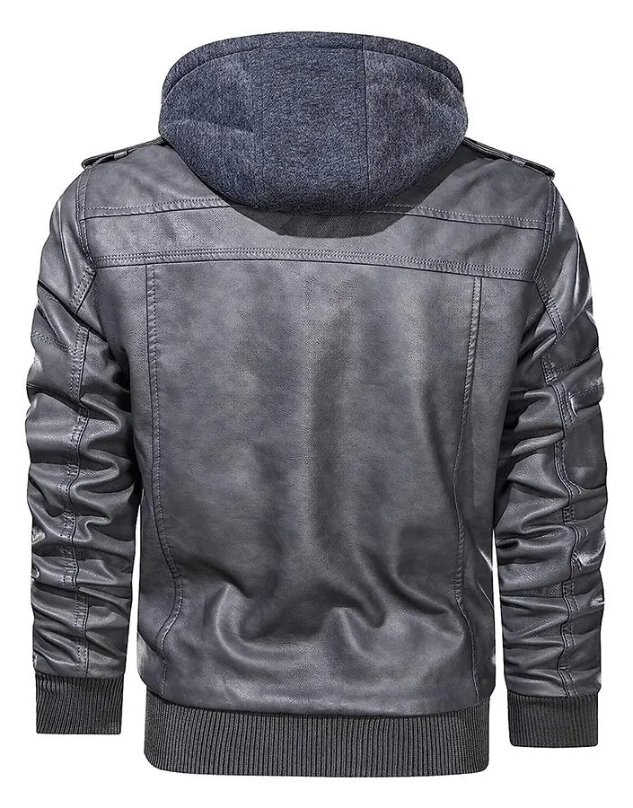 Men’s Grey Leather Jacket with Removable Hood – Stylish & Versatile