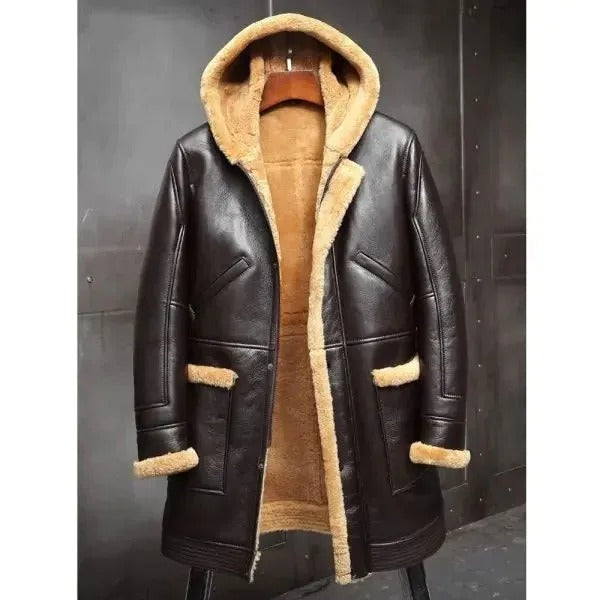 Men's RAF Hooded Shearling Fur Sheepskin Leather Long Jacket Winter Coat