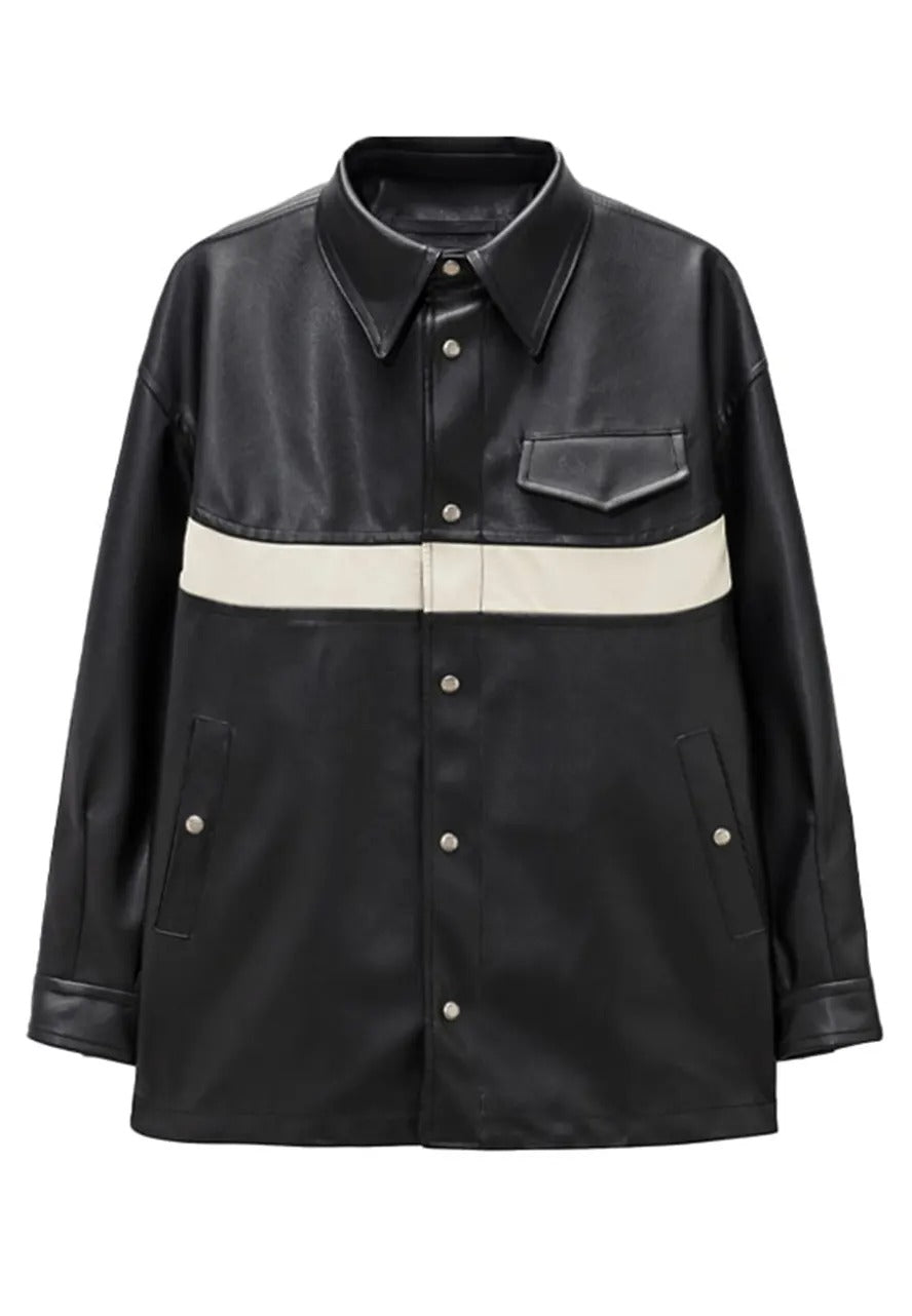 Men’s Shirt Style Black Leather Jacket with White Stripes – Bold & Stylish