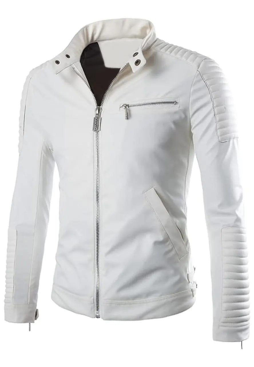 Men’s Slim Fit Zip-Up White Leather Biker Jacket