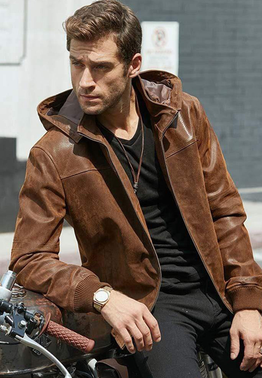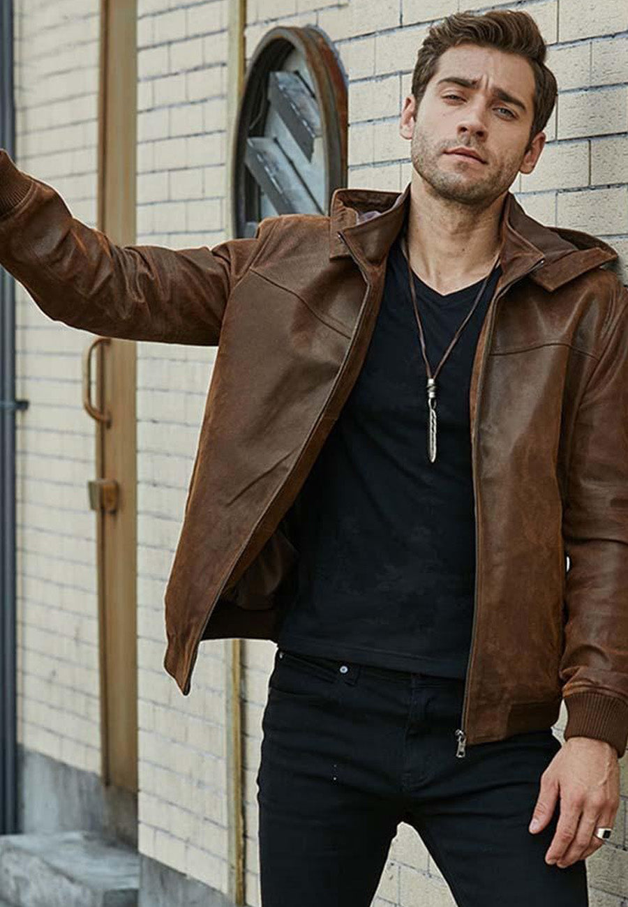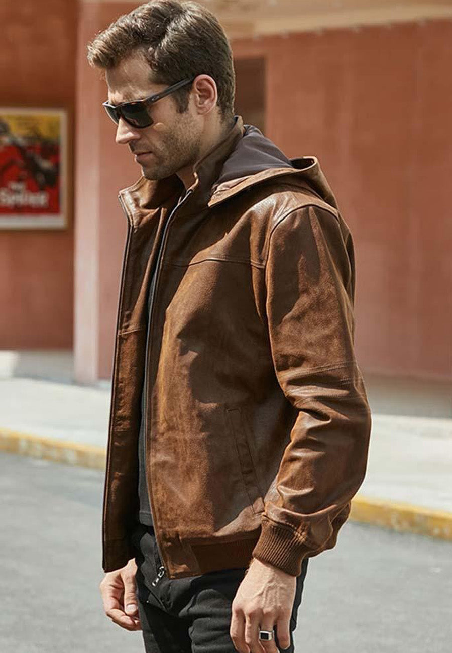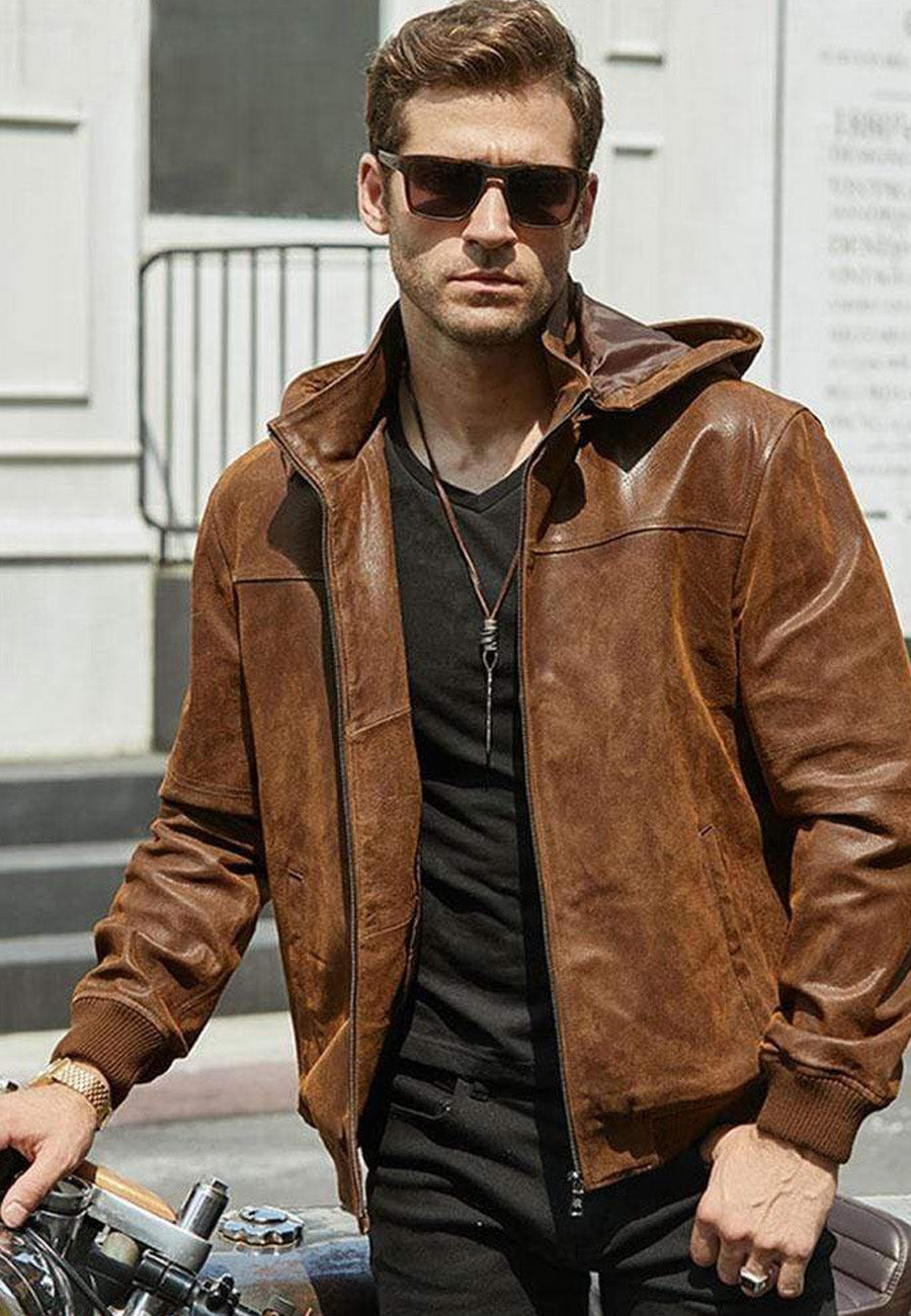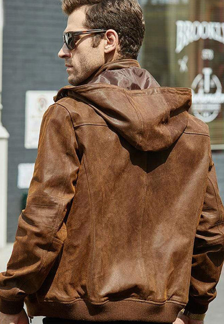Men’s Tan Brown Leather Bomber Jacket Removable Hood