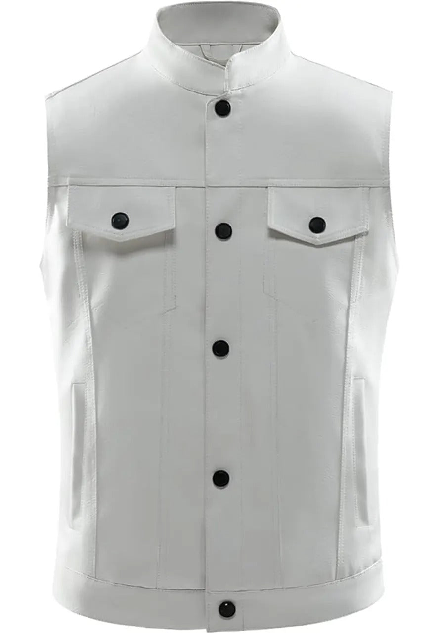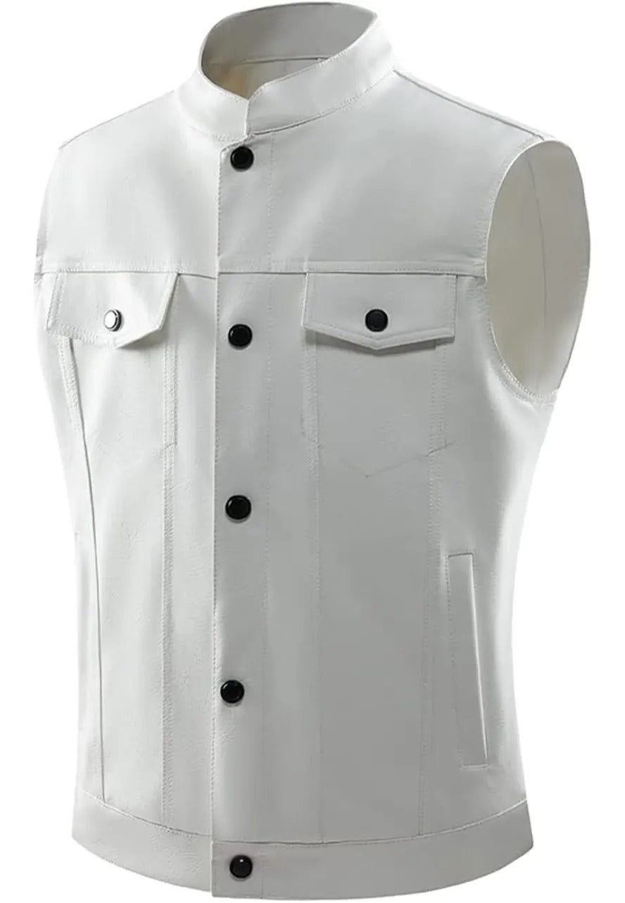 Step up your style game with this Men’s White Faux Leather Biker Vest, combining modern design with eco-friendly materials. Crafted from high-quality faux leather, it offers a sleek white finish, durable construction, and a timeless biker-inspired look. Perfect for casual outings, rides, or layering, it ensures comfort and a standout appeal. A great choice for fashion-conscious bikers or anyone seeking cruelty-free leather alternatives.