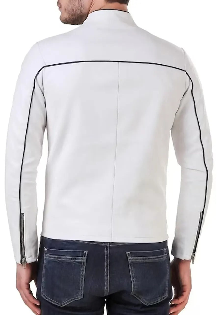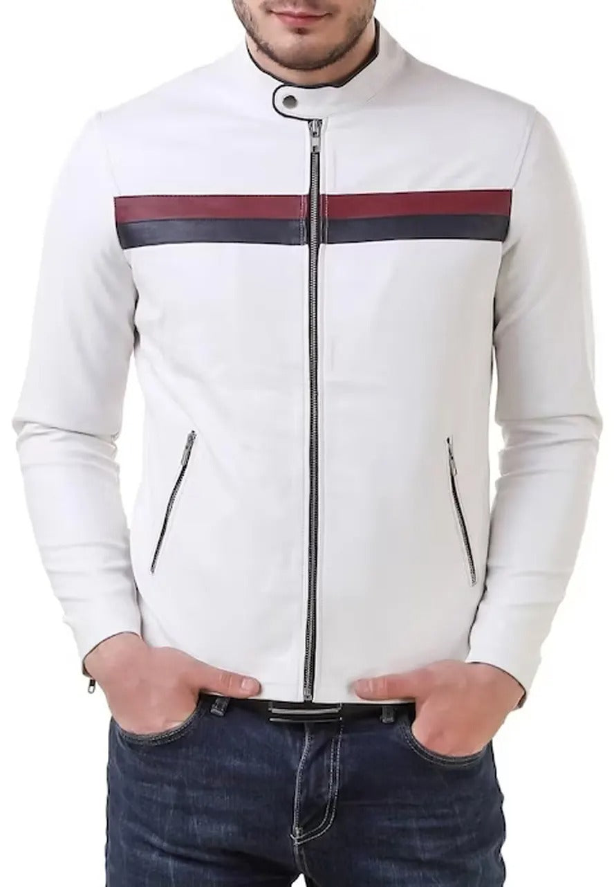 Men’s White Leather Biker Jacket with Red and Black Stripes