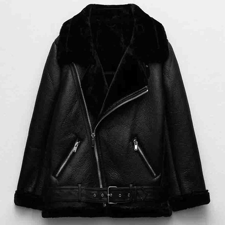 New Women's Sheepskin Leather Biker Jacket with Belt