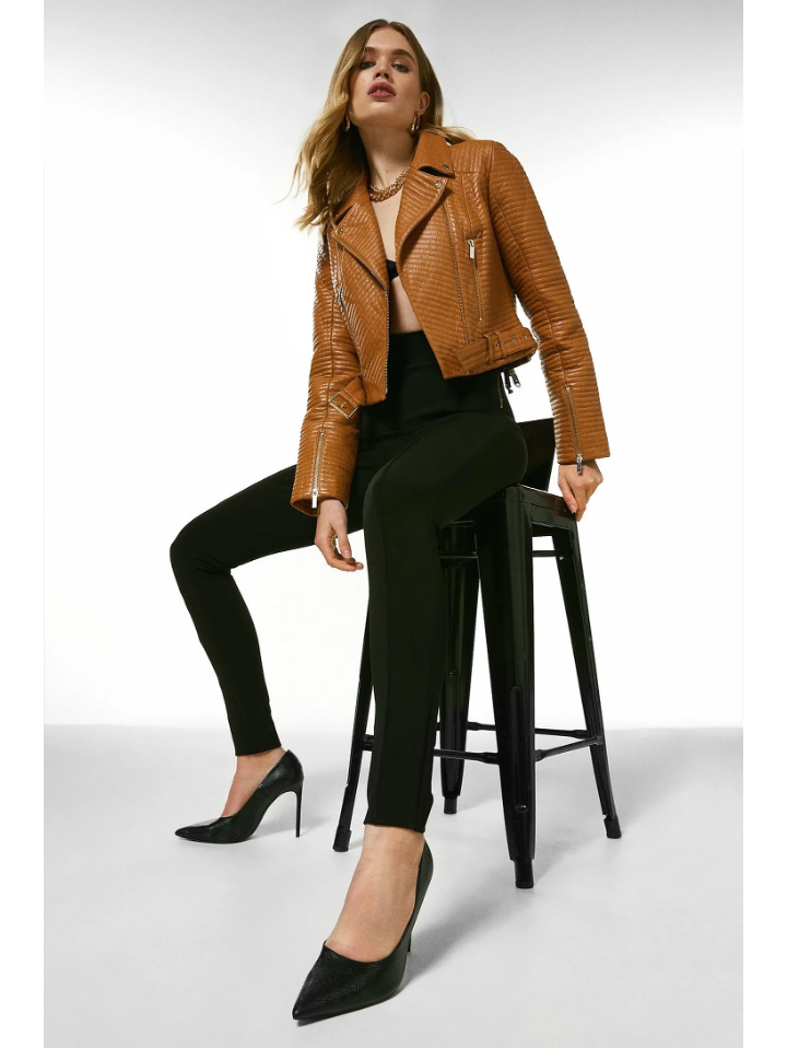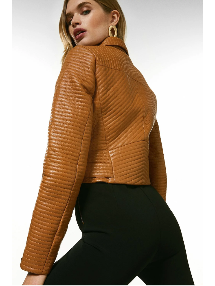 This Women's Tan Brown Leather Biker Jacket is crafted from premium sheepskin leather and features a crew neck, zip front closure, and two outer and two inner pockets for optimal storage. Enjoy free shipping and an affordable price.