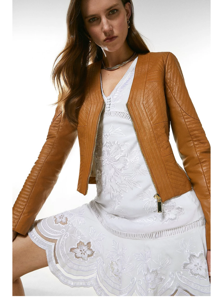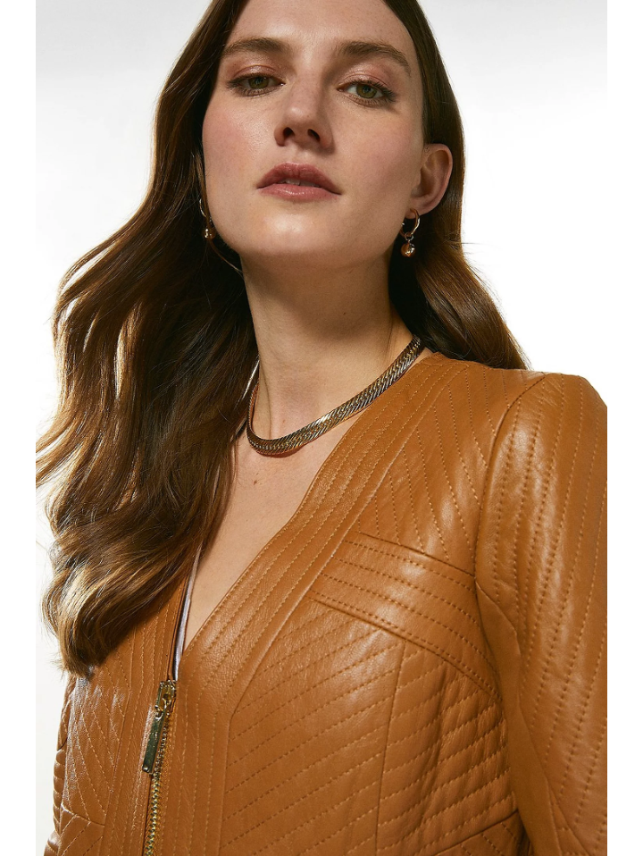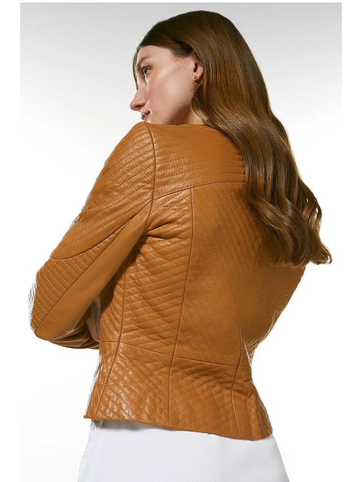 Stay stylish with this high-quality Women's Tan Brown Leather Jacket V Neck, featuring a V-shaped collar and full zip closure. Made of sheepskin leather for durability and comfort, this biker jacket comes with two outer and two inner pockets. Free shipping with an affordable price!