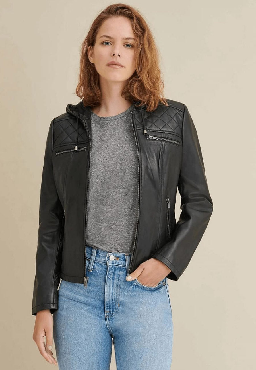 Women's Black Leather Hooded Biker Jacket
