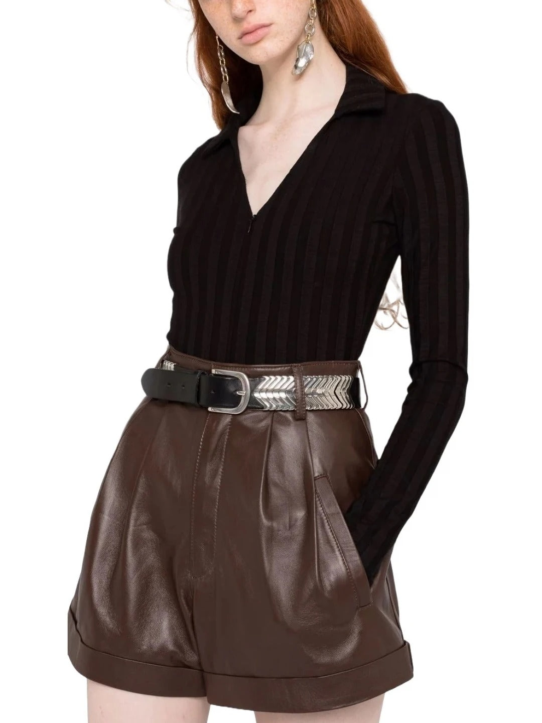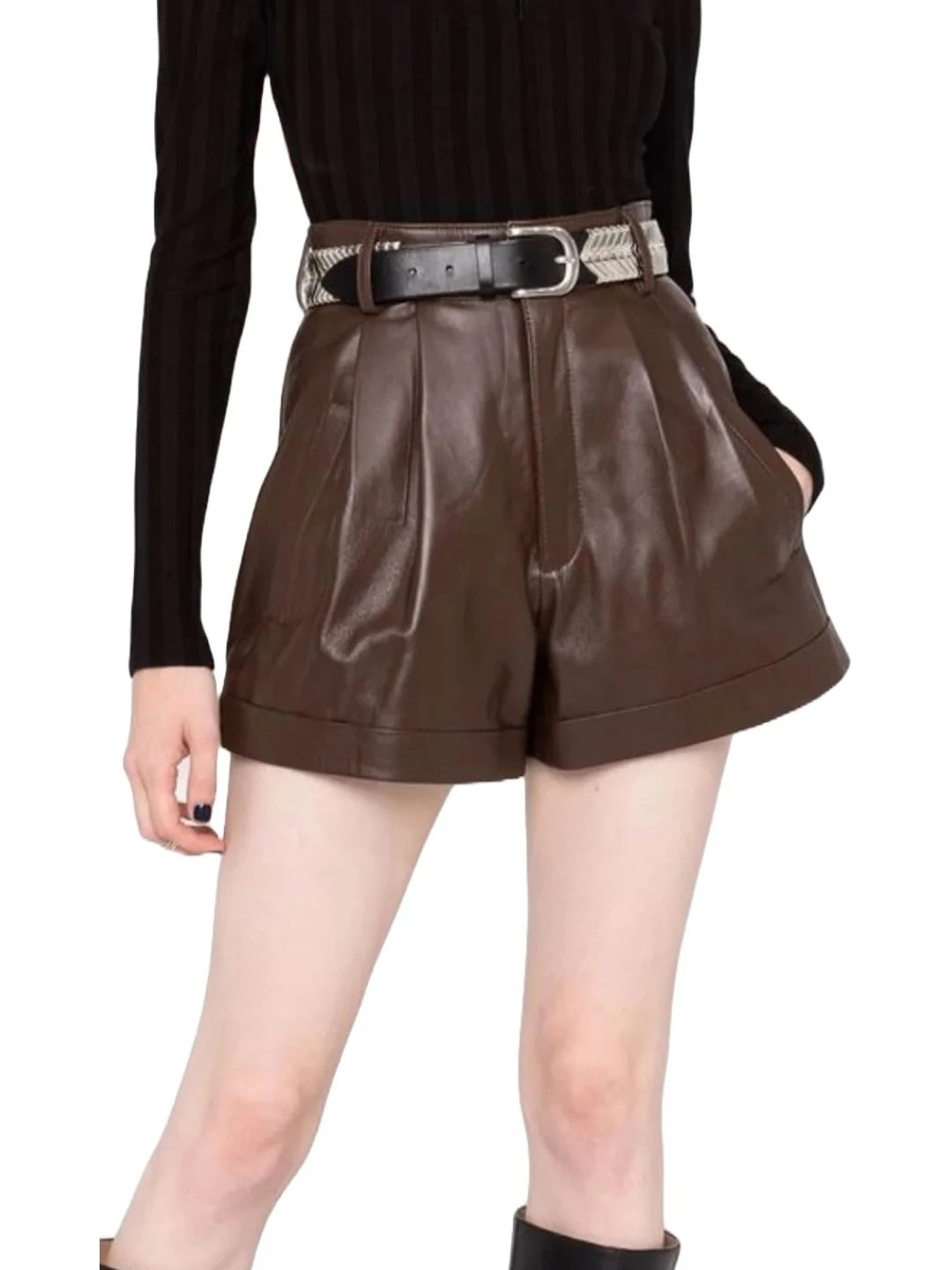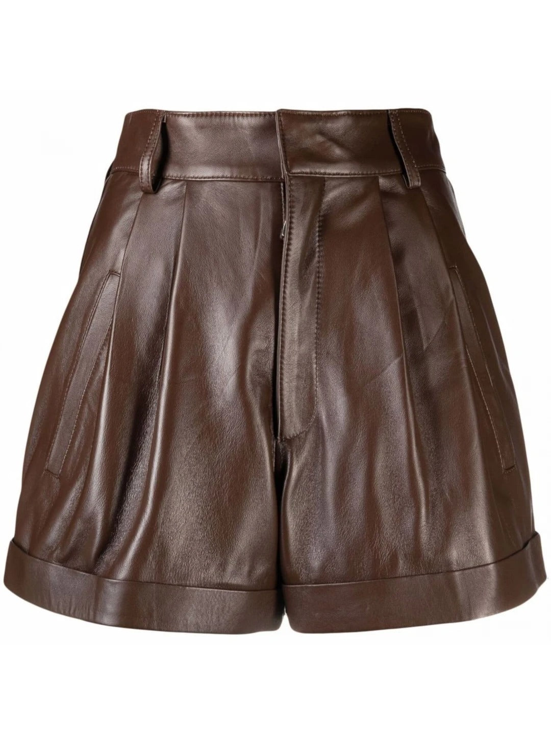 Women's Brown Leather Shorts with Pleated Detailing – Chic & Structured Fit