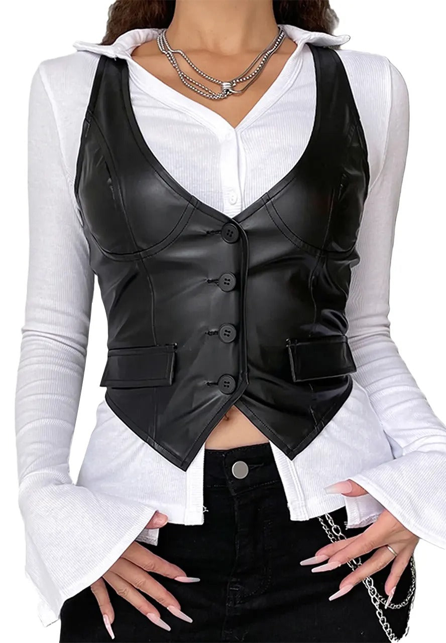 Sleek and modern, the Women's Cropped Black Leather Vest delivers edgy vibes with a flattering cut. Made from genuine leather, this bold piece elevates any look—perfect for styling over tees, tanks, or dresses. Lightweight yet statement-making, it's a must-have for trendsetters who love timeless black with a twist.