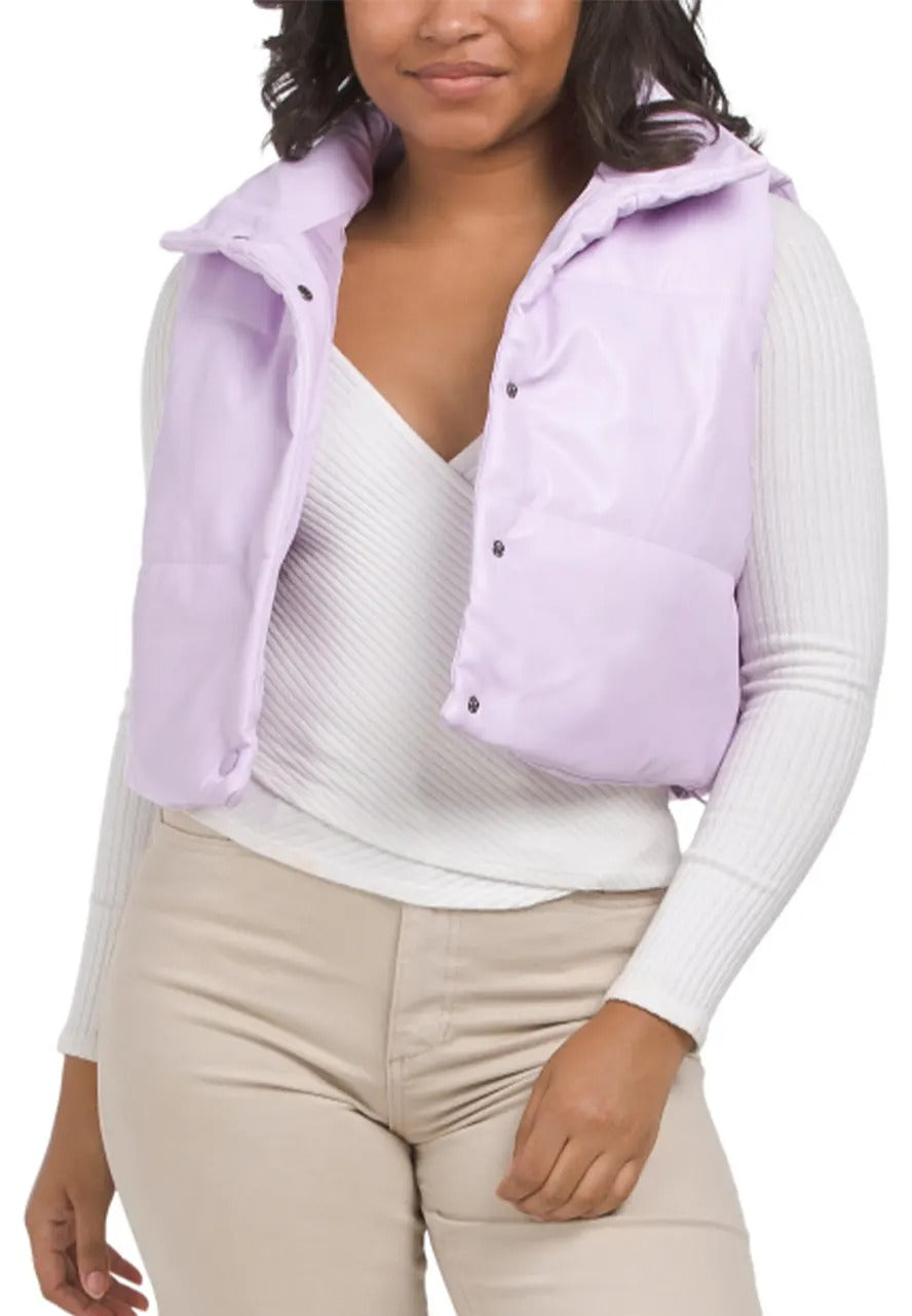 Women's Light Purple Leather Puffer Vest – Cozy & Stylish