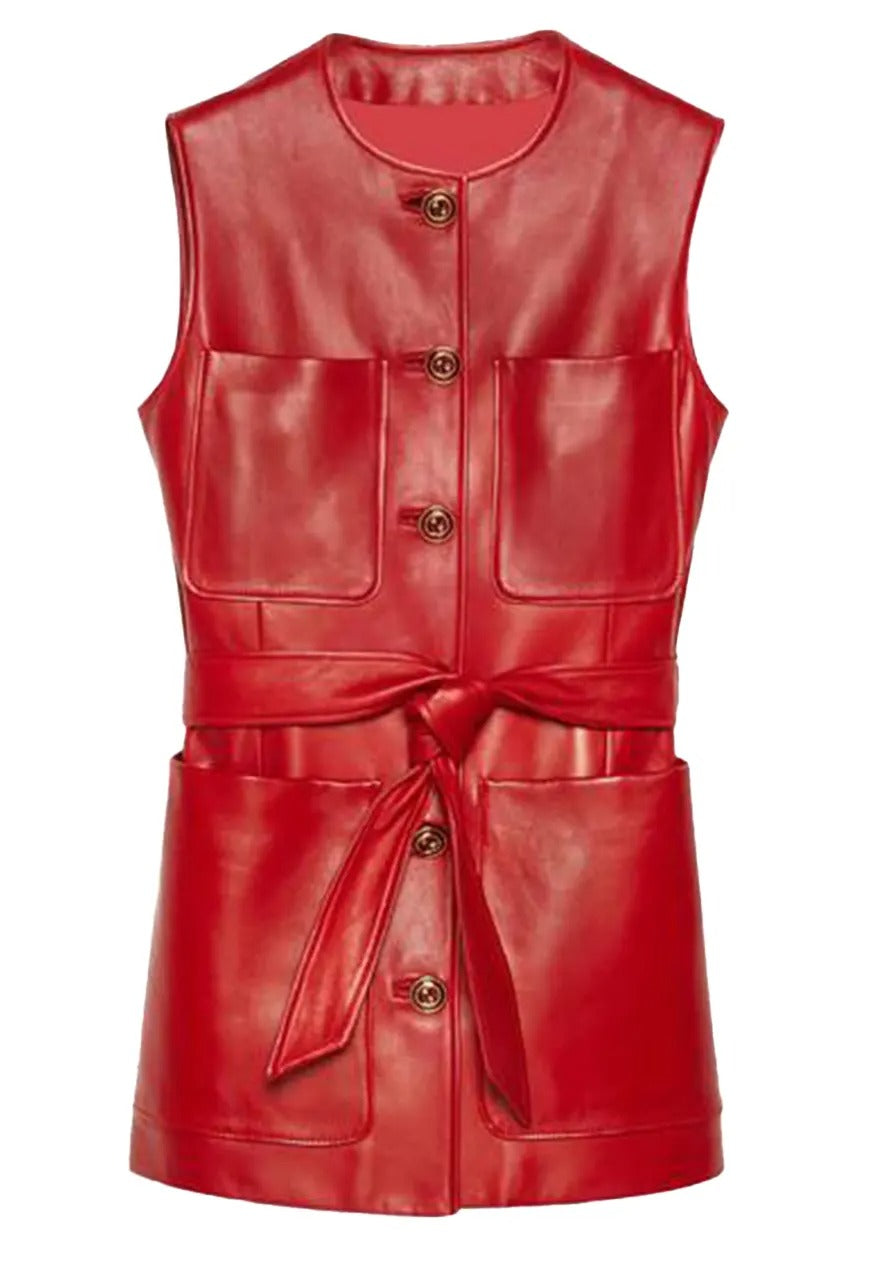 Make a bold fashion statement with this women’s red leather long vest, crafted from premium-quality leather for a sleek and sophisticated look. Featuring a tailored fit, a stylish open-front or buttoned design, and a soft inner lining for comfort, this vest is perfect for layering over casual or formal outfits. Elevate your wardrobe with this timeless piece.